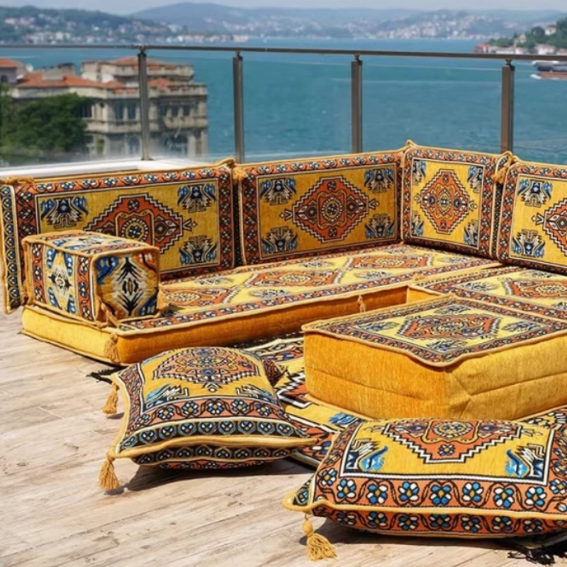 Yellow L Shaped Arabic Majlis Sofa Set Pallet Cushions bring vibrant color and cozy comfort to your social seating spaces. The set establishes an ideal corner seating design through its L-shaped layout which perfectly suits majlis spaces and living rooms and lounge areas. The cheerful yellow tone adds warmth and energy to your décor while enhancing traditional Arabic style seating.